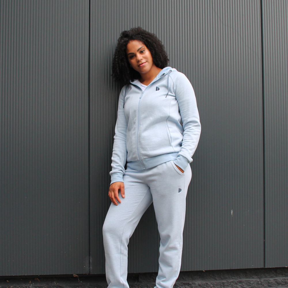 De lichtblauwe dames joggingbroek Carolyn draagt heerlijk tijdens het sporten, maar kan ook thuis worden gedragen. De brede, flexibele tailleband draagt heel comfortabel en is zeer vrouwvriendelijk. De broek heeft 2 steekzakken en een hoog boord onderaan de pijp. De broek is gemaakt van 65% Polyester en 35% katoen.